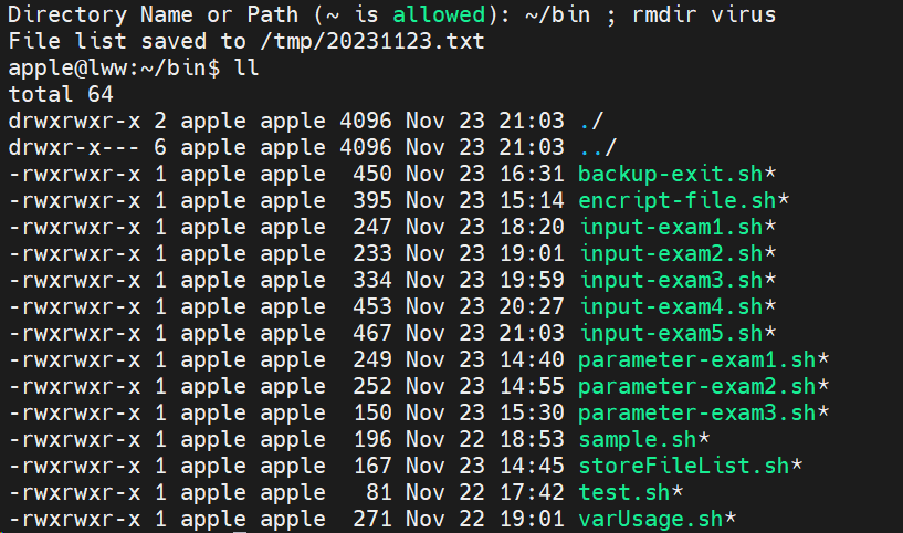 위 입력에 ; mkdir virus가 추가되었는데 리눅스에서는 명령어 여러 개를 한 줄로 처리하고 싶을 때 ';' 사용한다.