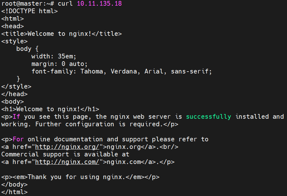 마스터 노드에서 curl 명령으로 multipod의 IP를 입력하면 웹페이지가 표시될 것인데 이는 nginx의 웹페이지다.
