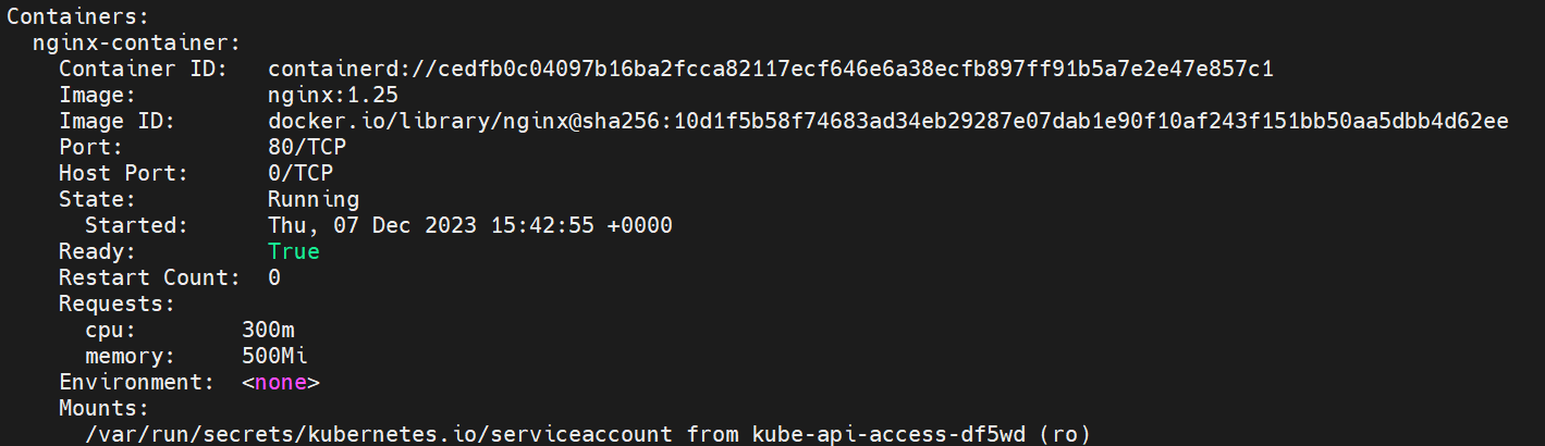 즉, 컨테이너가 실행되는데 사용할 리소스를 제한했다면 안정적으로 운영하기 위해서는 그만큼의 리소스를 수용할 수 있는 공간이 노드에 있어야 한다고 쿠버네티스가 판단하여 자동으로 입력한 것이다.