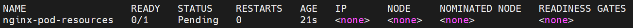 상태는 Pending으로 아직 적절한 노드를 찾지 못한 상태에서 스케줄러가 계속 대기하고 있는 것이다.