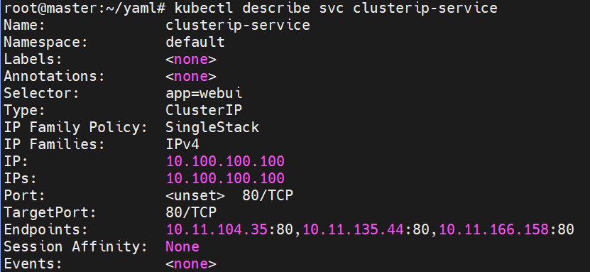 위 yaml코드에서 의도한대로 10.100.100.100 이라는 가상 IP에 3개의 파드가 묶인 것을 볼 수 있다.