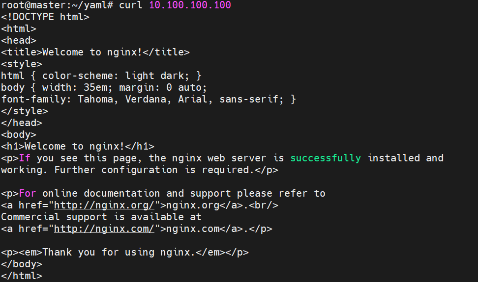 curl 명령으로 위 10.100.100.100 으로 접속하게 되면 ClusterIP는 3개의 파드 중 하나에게 트래픽을 전달하여 nginx의 HTML코드를 반환하게 된다.