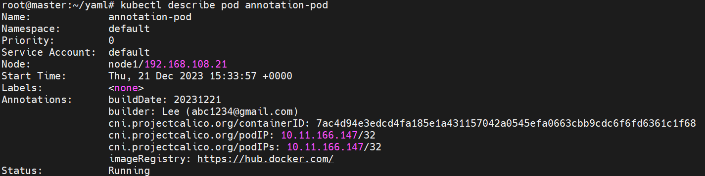 kubectl describe 명령을 사용하면 다음과 같이 애너테이션 정보가 표시된다.