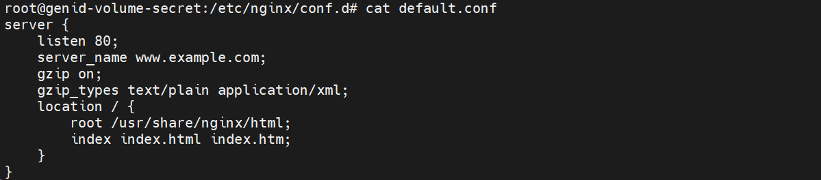 | default.conf | server { listen 80; server_name http://www.example.com; gzip on; gzip_types text/plain application/xml; location / { root /usr/share/nginx/html; index index.html index.htm; } } |