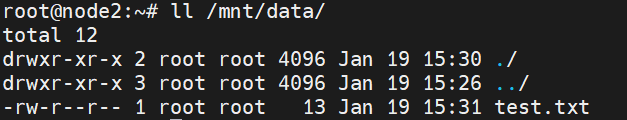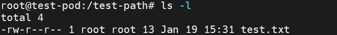 파드 내부에 진입한 후 바인딩한 PV내부에 test.txt라는 이름의 파일을 생성했다.