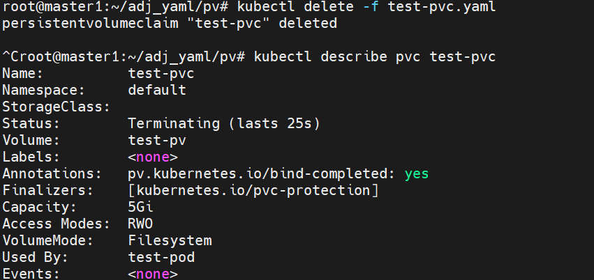 삭제를 하더라도 Terminating 상태에 머무르며 PVC가 없어질 때까지 기다린다.