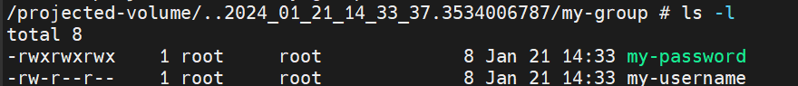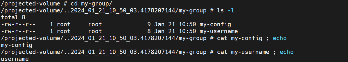 configmap의 내용이 들어있는 my-config와 secret의 내용이 들어있는 my-username파일이 생성되었다.