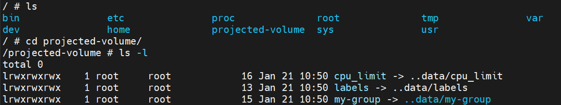 projected-volume이라는 디렉토리 내에 설정한 내용과 같이 파일과 디렉토리가 생성되었다.