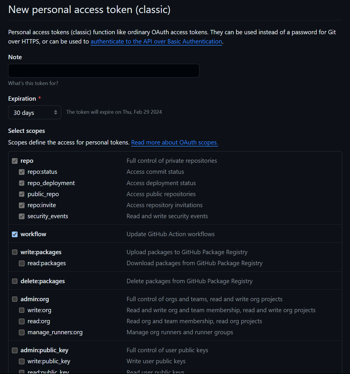 생성 화면에서 원하는 토큰 이름을 지정하고 workflow를 체크한 후 맨 아래 Generate token을 클릭하여 생성한다.